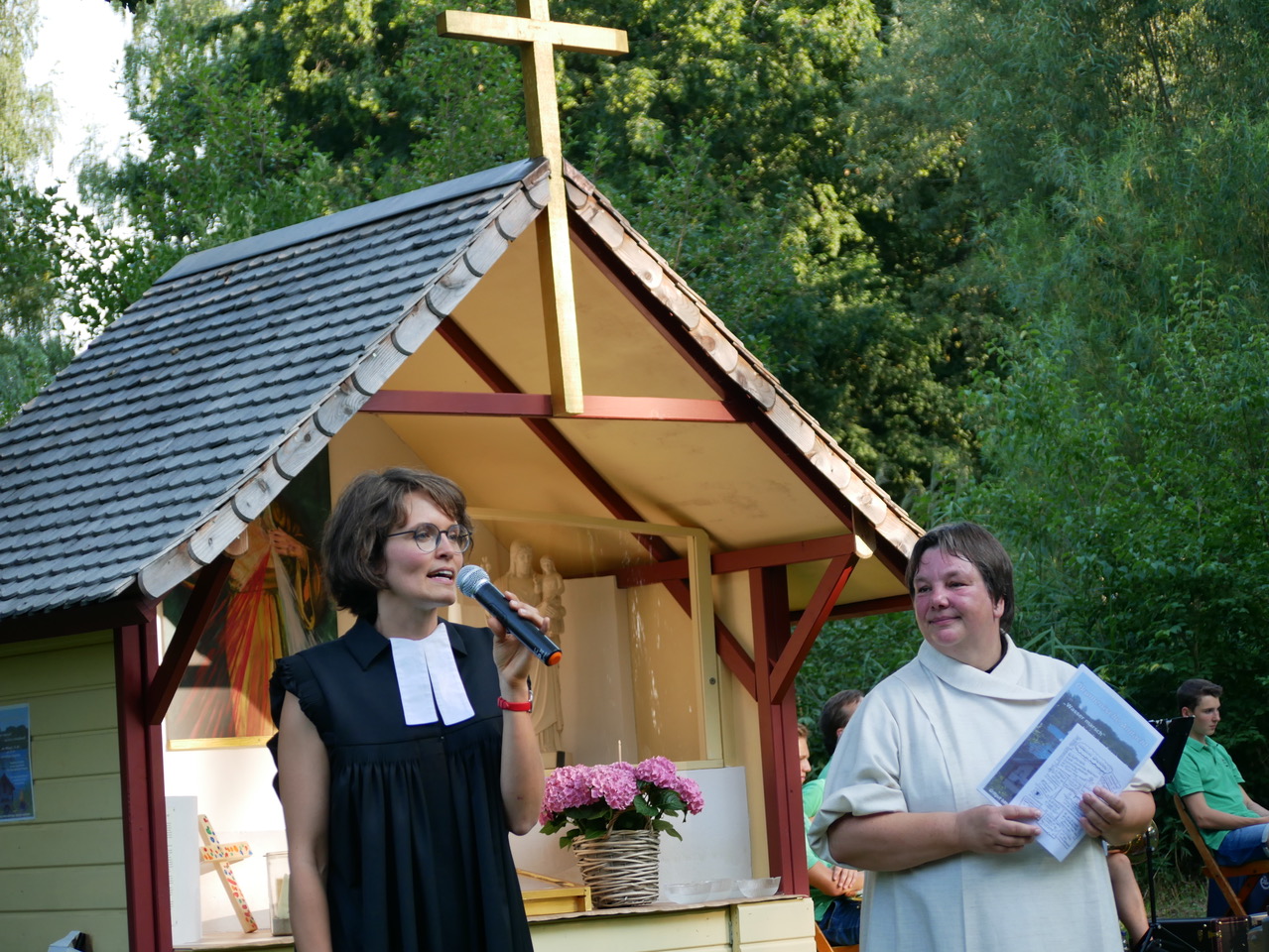 Die katholische Gemeindereferentin Andrea Hoffmann und die evangelische Vikarin Julia Kaiser leiteten in heiterer Stimmung mit hochgekrempelten Gewändern durch den Gottesdienst. In spontanen Beiträgen wurde der Satz, „wenn ich an Wasser denke, denke ich an…“ von den Gottesdienstbesuchern vervollständigt. Währenddessen durften Kinder mit einer Kübelspritze der Ertinger Feuerwehr die Wassergedanken „greifbar“ werden lassen.
