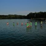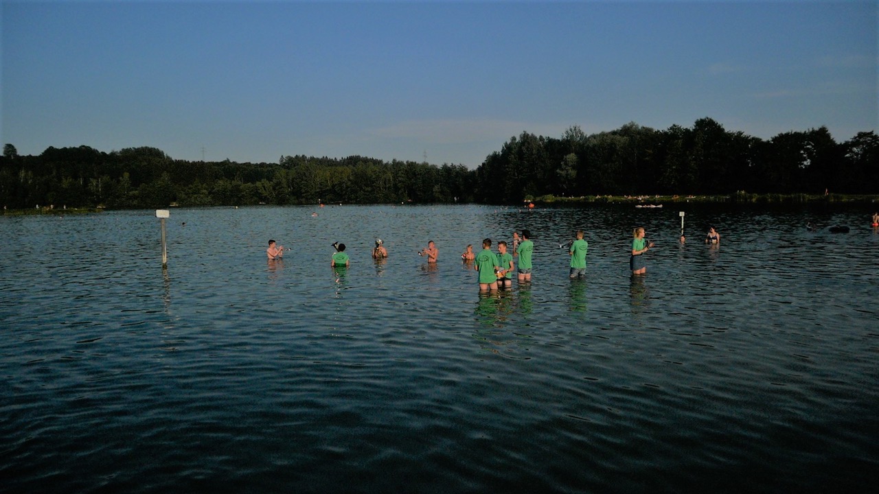 Nach einem lauten „Wasser marsch!“ sprangen zum krönenden Abschluss Vikarin Kaiser und Gemeindereferentin Hoffmann in voller Montur gemeinsam in den See. Was für eine Gaudi!